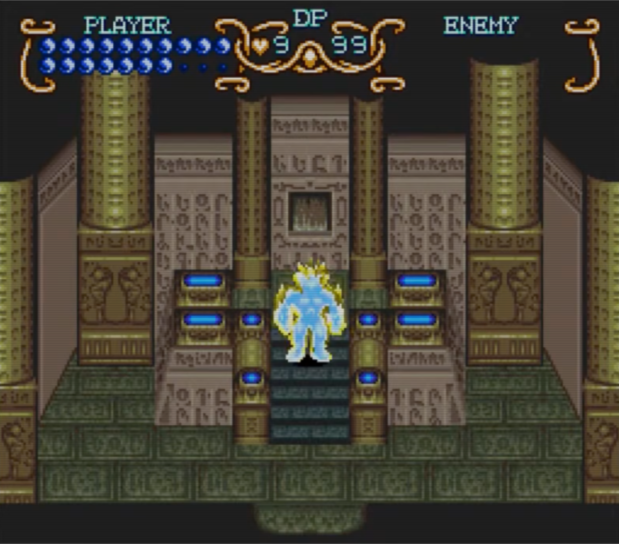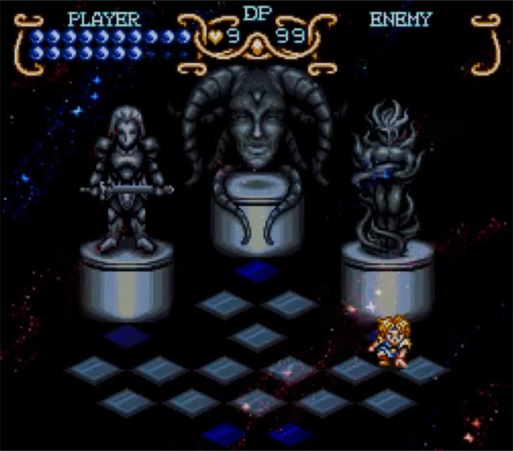 La Super Nintendo dispose d’une croix directionnelle, de quatre boutons et de deux gâchettes, mais Illusion of Time exploite mal cette richesse. Les boutons X et Y ne sont pas utilisés, et les gâchettes L et R remplissent exactement la même fonction.